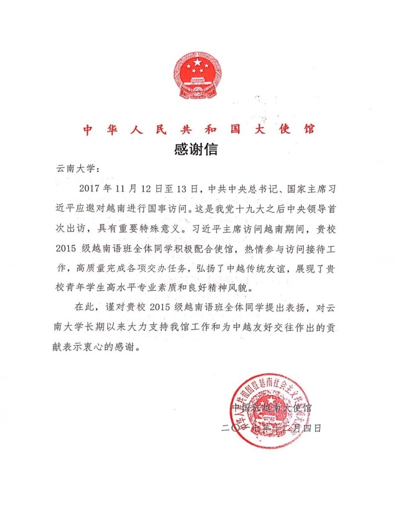2017年11月12日至13日,中共中央总书记、国家主席习近平应邀对越南进行国事访问,这是我党胜利召开十九大之后中央领导人的首次出访,具有重要的特殊意义。在习近平主席访问越南期间,我校正在河内师范大学交流学习的2015级越南语专业21名同学,在中华人民共和国驻越南社会主义共和国大使馆的组织带领下参加了接待工作并圆满完成各项工作任务,受到大使馆的感谢与表扬。中国驻越南大使馆在给我校伟德bv1946官网的感谢信中提到:贵校2015级越南语班全体同学积极配合使馆,热情参与访问接待工作,高质量完成各项交办任务,弘扬了中越传统友谊,展现了贵校青年学生高水平专业素质和良好的精神风貌。同时,对BV1946官方网站长期以来大力支持我馆工作和为中越友好交往做出的贡献表示了衷心的感谢。